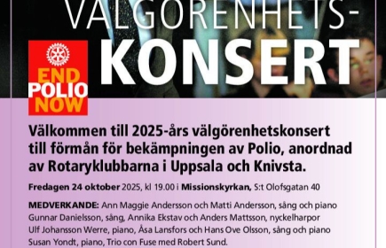 Rotaryklubbarna i Uppsala och Knivsta ger sin årliga konsert till förmån för Rotarys arbete med att utrota Polio. Rotarys Eldsjälspris 2025 delas ut vid konserten. Missionskyrkan i Uppsala 24 oktob...